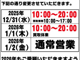 年末年始営業時間のお知らせです。年末年始の営業時間を下記の通り変更させていただきます。2025/12/31(水) 営業時間 10:00~20:00買取業務 10:00~17:002026… -