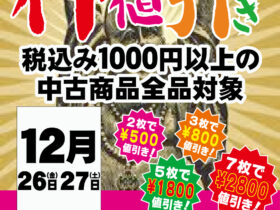 今年最後の神値引きキャンペーン開催!!買えば買うほどに安くなる神がかった値引きキャンペーン!待ち遠しい次の神日は・・・12月26(金)、27(土)の2日間です!さらに12/28(日)は、、、今… -
