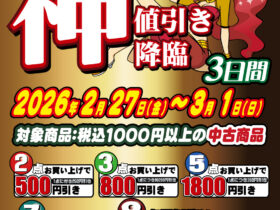 毎月おなじみ神値引きキャンペーン開催!!買えば買うほどに安くなる神がかった値引きキャンペーン!待ち遠しい次の神日は・・・2/27(金)、28(土)、3/1(日)の3日間です!中古商品は現品限り! 神値引き… -