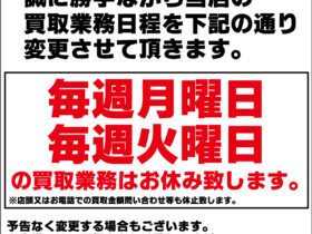 誠に勝手ながら2026年5月11日から当店の買取業務日程を下記の通り変更させて頂きます。毎週月曜日・火曜日の買取業務はお休み致します。※店頭又はお電話での買取金額問い合わせ等も休止致します。予告なく変…