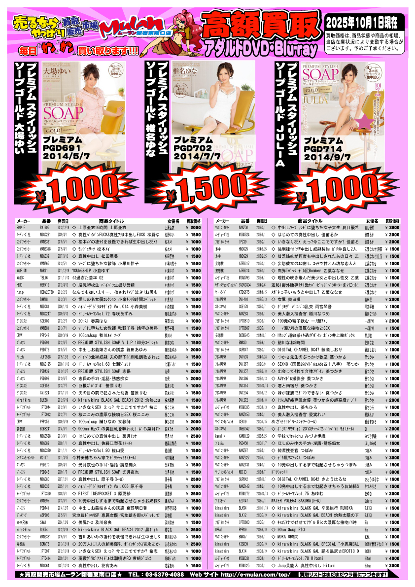 - 【ムーラン新宿東南口店】月刊アダルトDVD買取強化 2025年10月更新分
