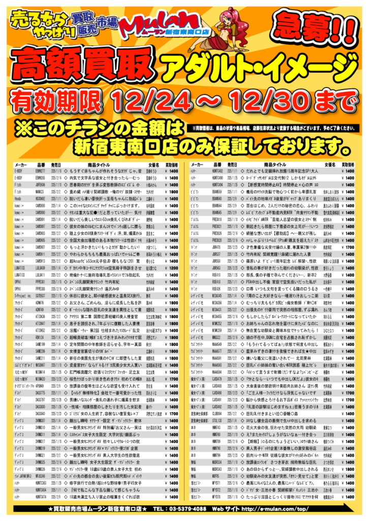 - 【新宿東南口店】週刊アダルトDVD買取強化2025年12月24日~2025年12月30日